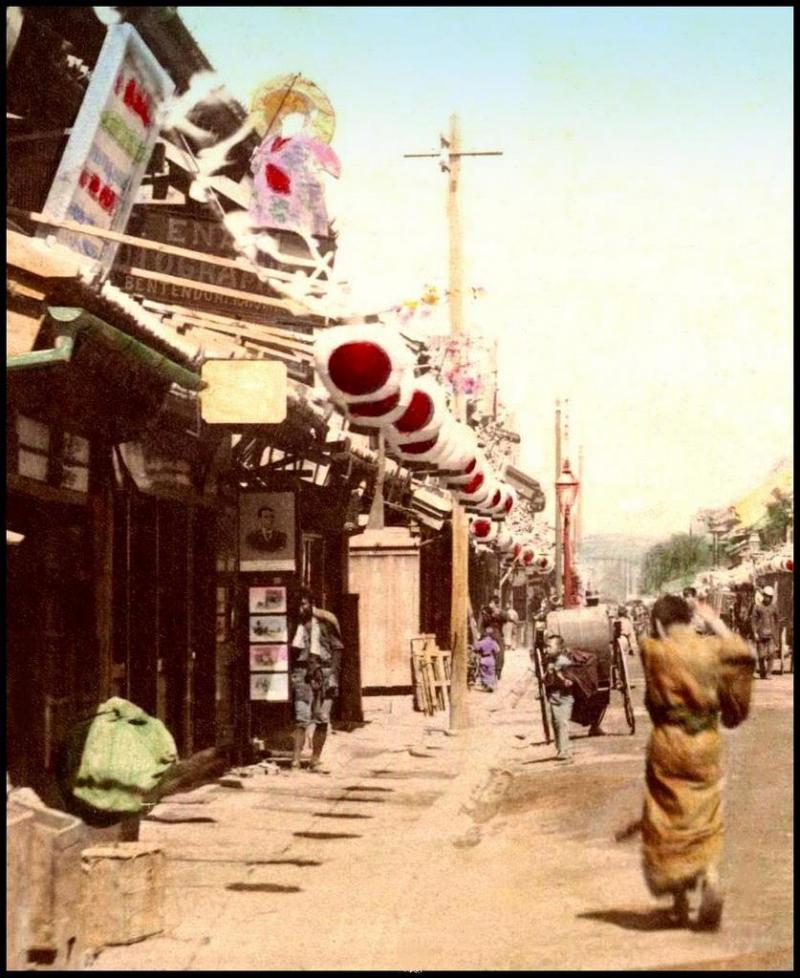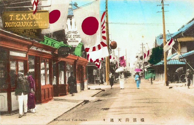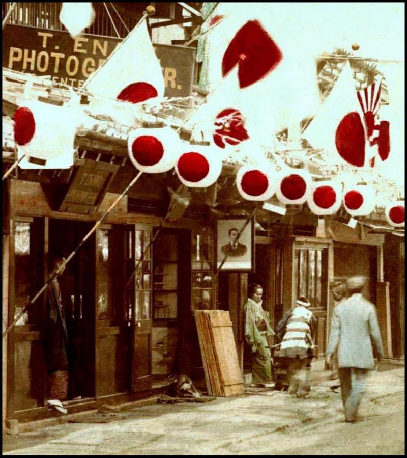 ABOVE : One of the earliest know photographs of Enami's relatively small, but highly-productive studio at No.9 Benten Street in Yokohama, ca.1894-95. Perhaps that is Enami himself, or an assistant standing in the doorway. A large, sample portrait is on display. What appears to be part of a glass skylight is seen behind bars on the second floor. I assume that larger skylights were incorporated into another part of the building. Photo possibly taken by K. Tamamura who took the photo below.
