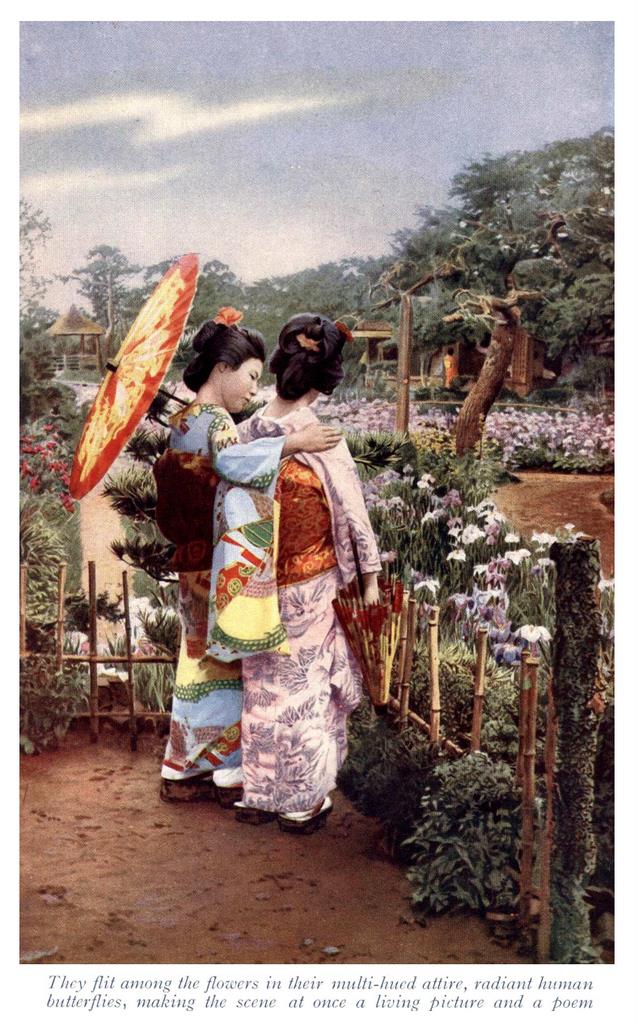One of the eight color plates from the book described below, and the effusive caption describing the loveliness of Japan's GEISHA. This 1922 three-color halftone was made from a ca.1898-1908 half-stereoview negative. Below are two examples of about 30 b/w Enami images that appear in the same volume.