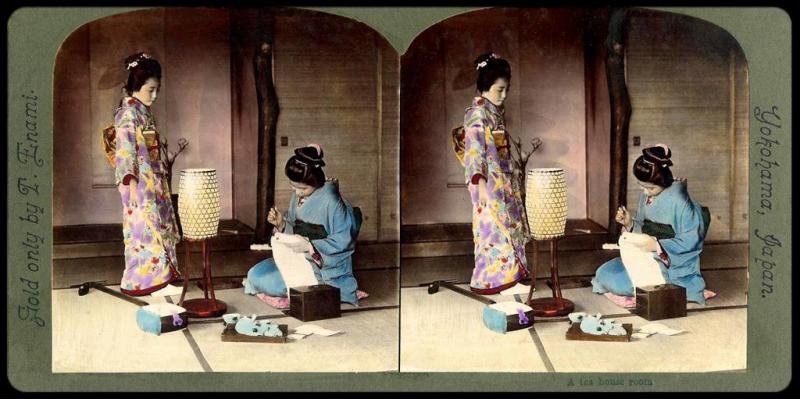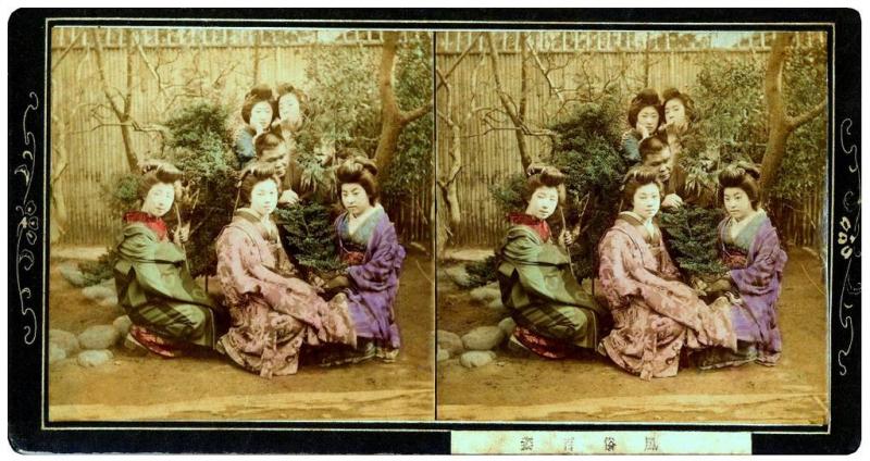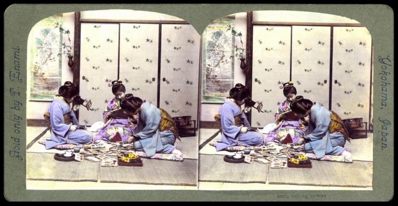 "S 26. Girls Looking at Pictures" A Maiko and two Geisha Looking at Stereoviews in Enami's Yokohama Studio. One of over 1000 cataloged 3-D images of old Japan.