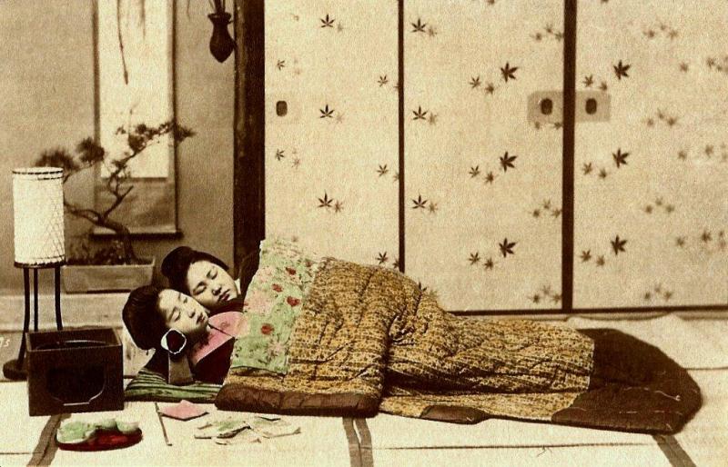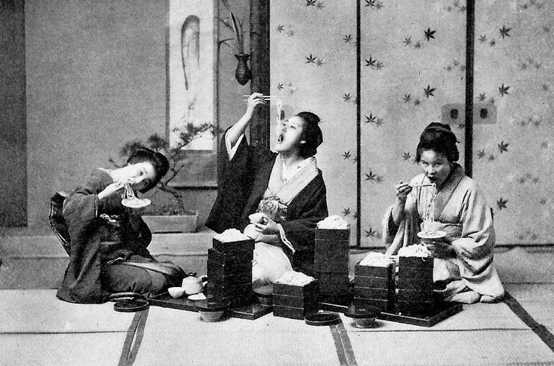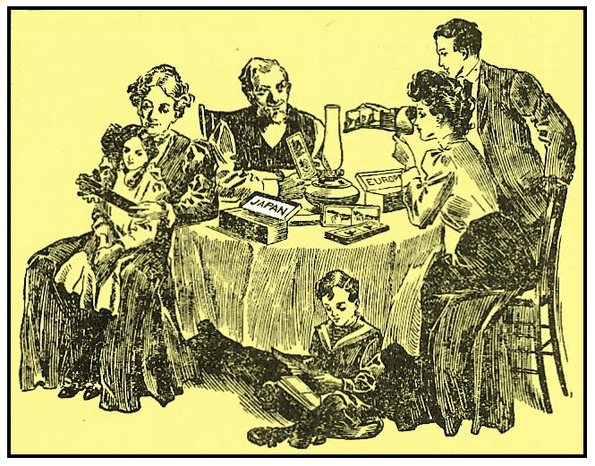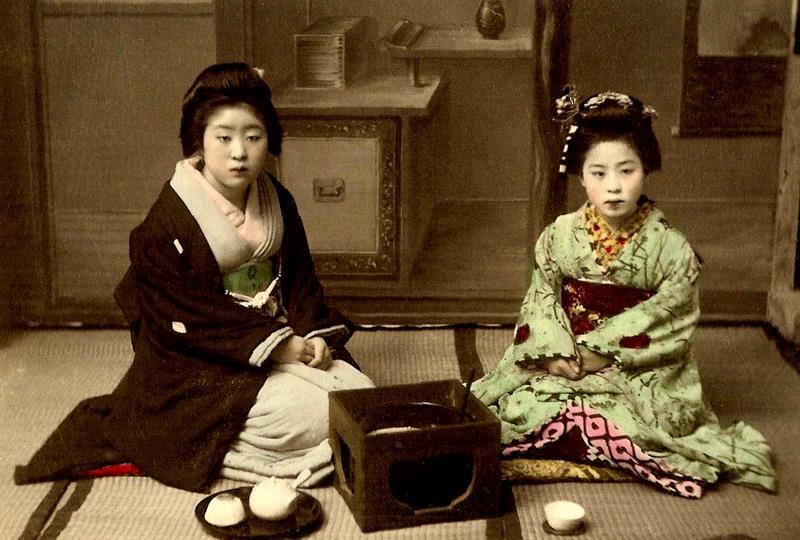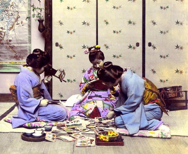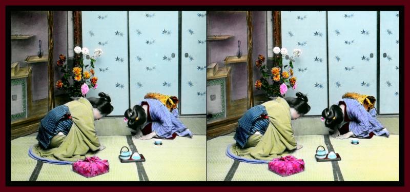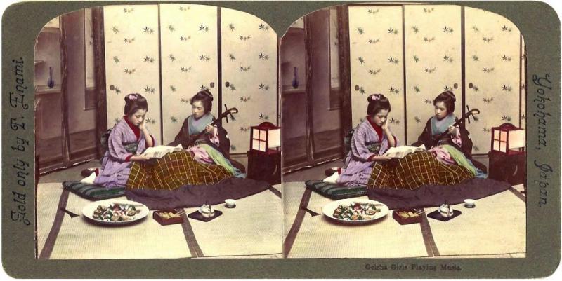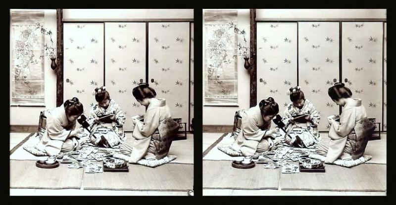 Two Geisha and a Maiko Looking at Stereoviews in T. Enami's Studio.Ca.1898-1907. A nice 3-D version of the above is shown on the Home Page. Scroll way down to see it.
