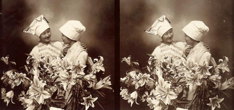 A Variant of Enami's "S 26 Girls Looking at Pictures". Enami took several variants of each title as back up. Occasionally they were published. This particular image is scanned from an un-transposed contact proof print. You can free-view it in 3-D using the "cross-eyed method. The mounted and colored stereoviews seen throughout this site can be free-viewed using the "parallel method". Good luck !