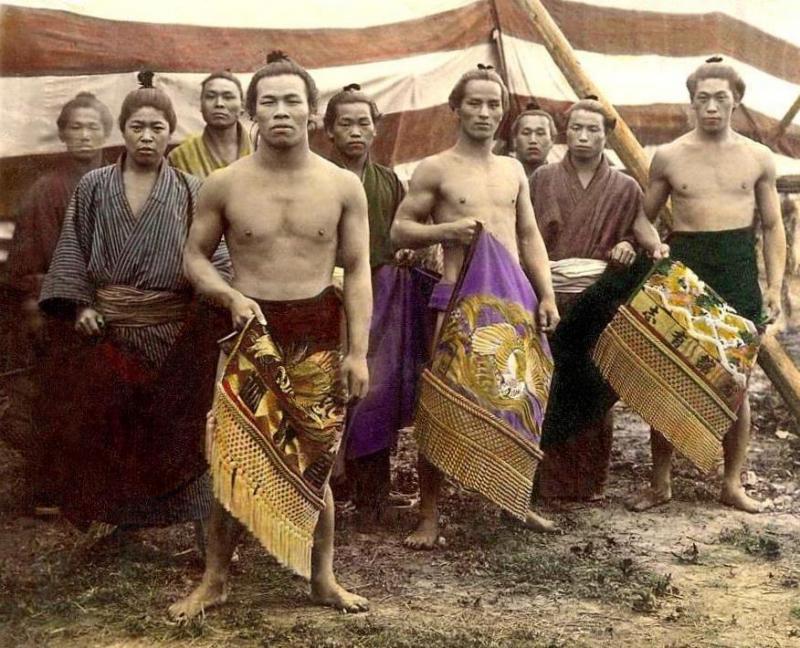 With some exceptions, all of the major commercial Japanese photographers during the Meiji-era offered at least one or two shots of Sumo Wrestlers locked in various grips, or in their victory poses.
