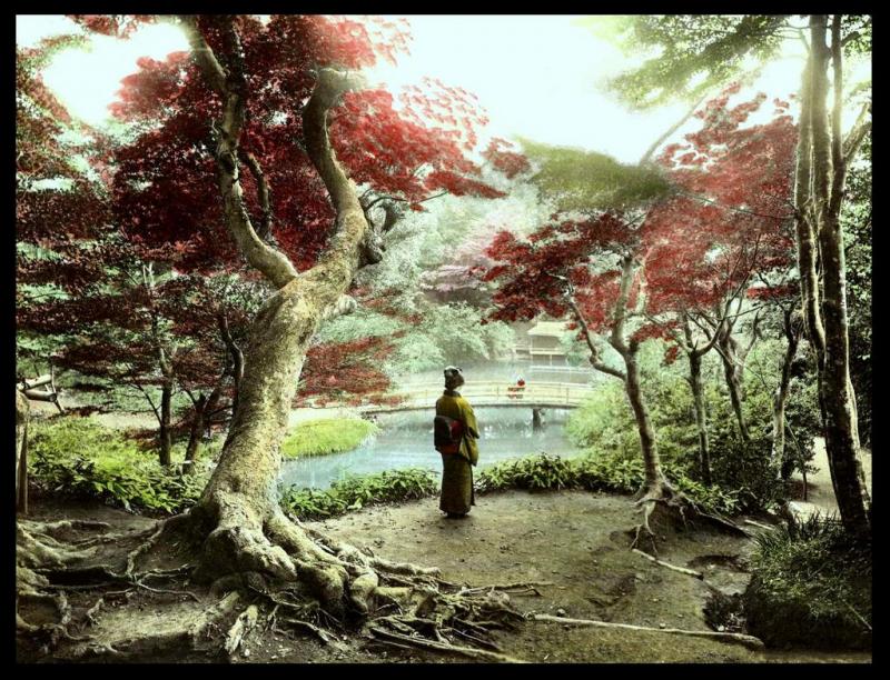 Two Geisha in the Genkyu Gardens of Hikone. Ca.1898-1910